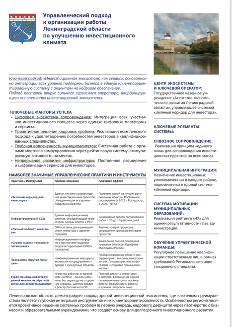 «Ленинградская область демонстрирует подход зрелой инвестиционной экосистемы, где ключевым преимуществом является интеграция инструментов и их клиентоориентированность. Особенностью региона является проактивное решение системных проблем (в первую очередь, кадрового дефицита) через партнерство с бизнесом и образовательными учреждениями, что создает основу для долгосрочного инвестиционного развития», - отмечено в издании Агентства стратегических инициатив.